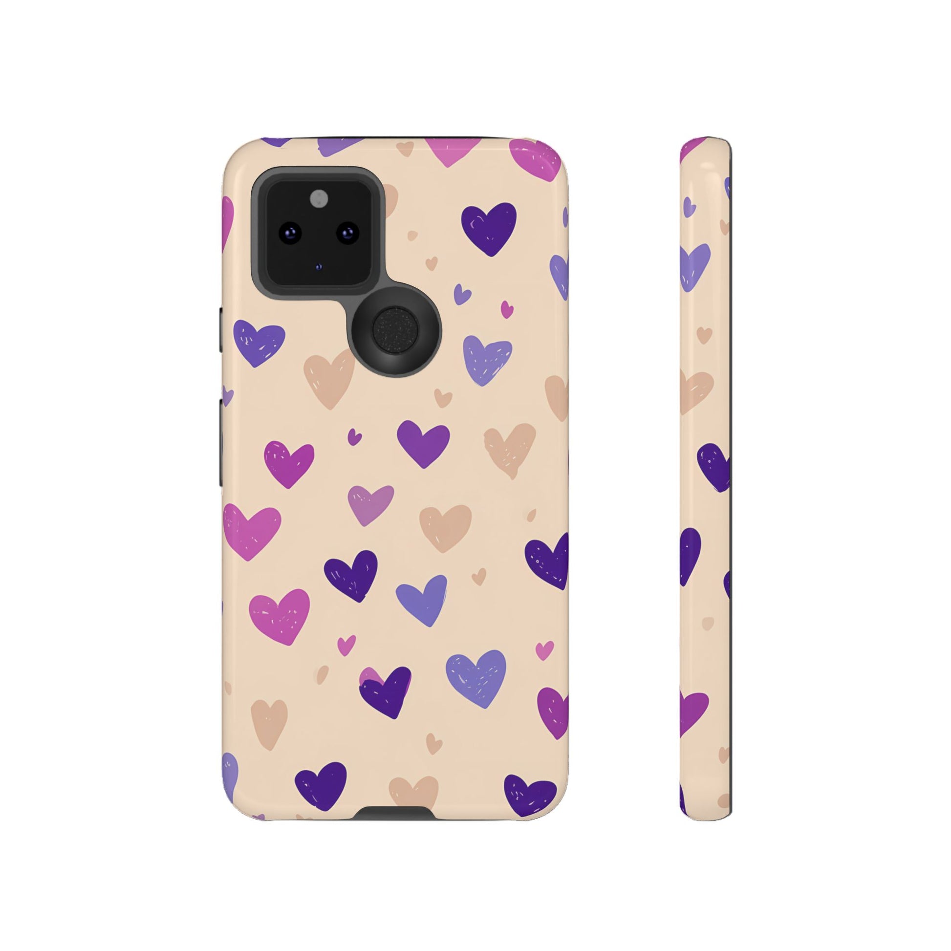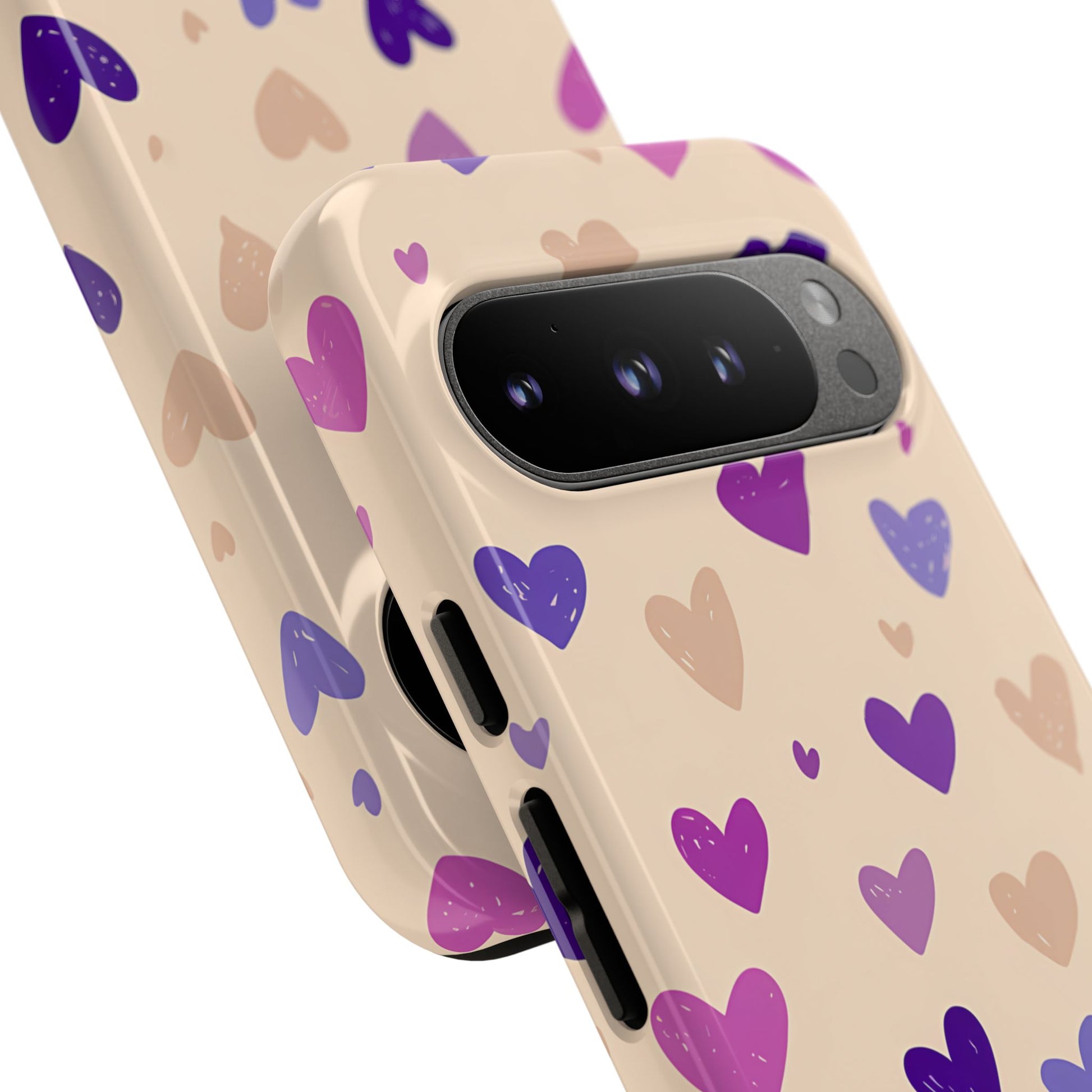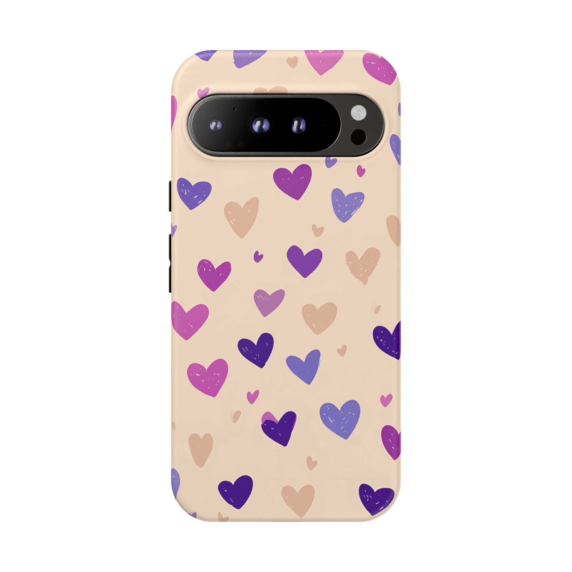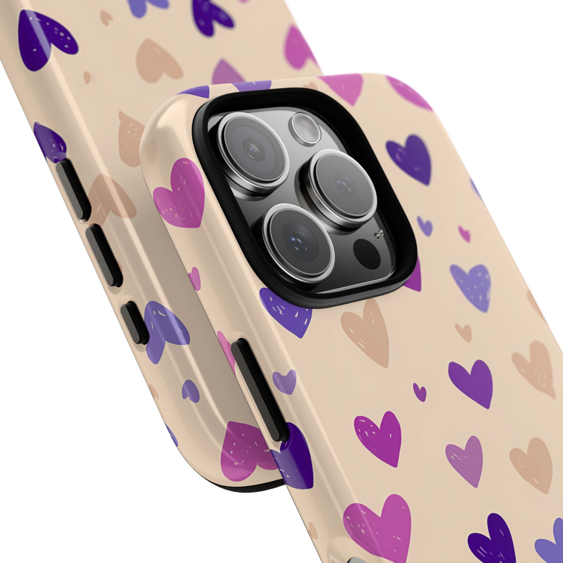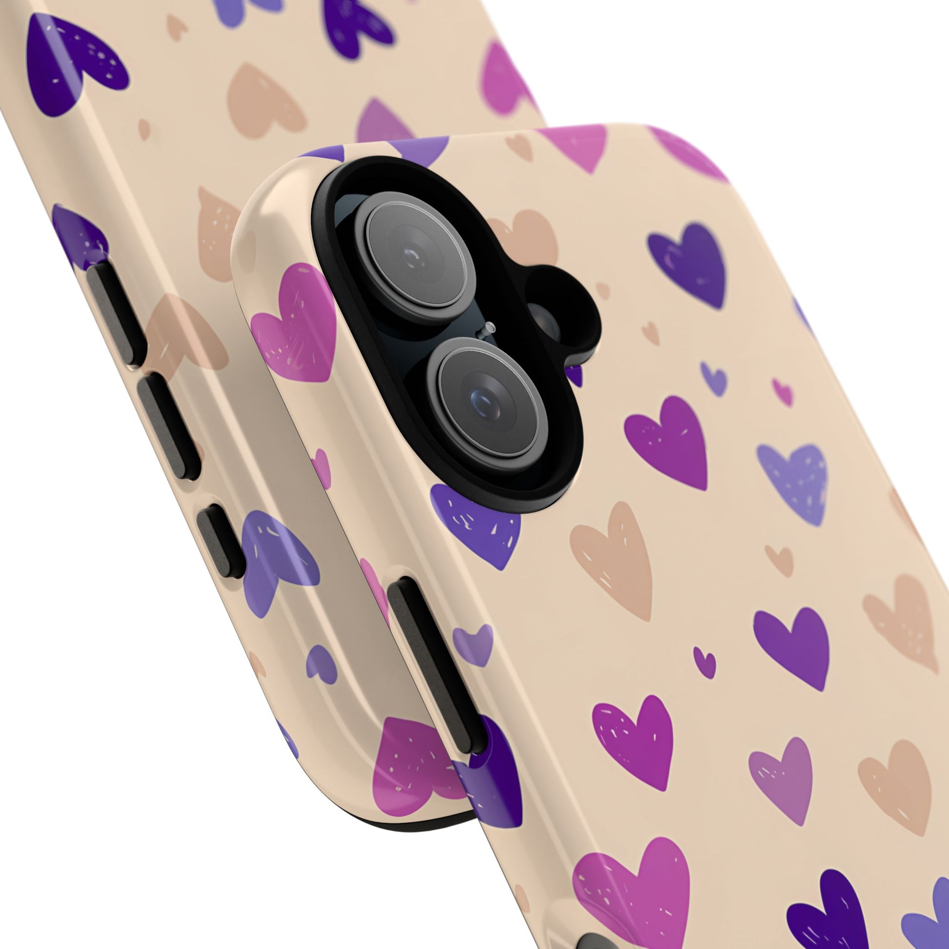 A soft, minimal pattern of purple and pink hearts floating on a gentle beige background, creating a cute and simple design full of charm.