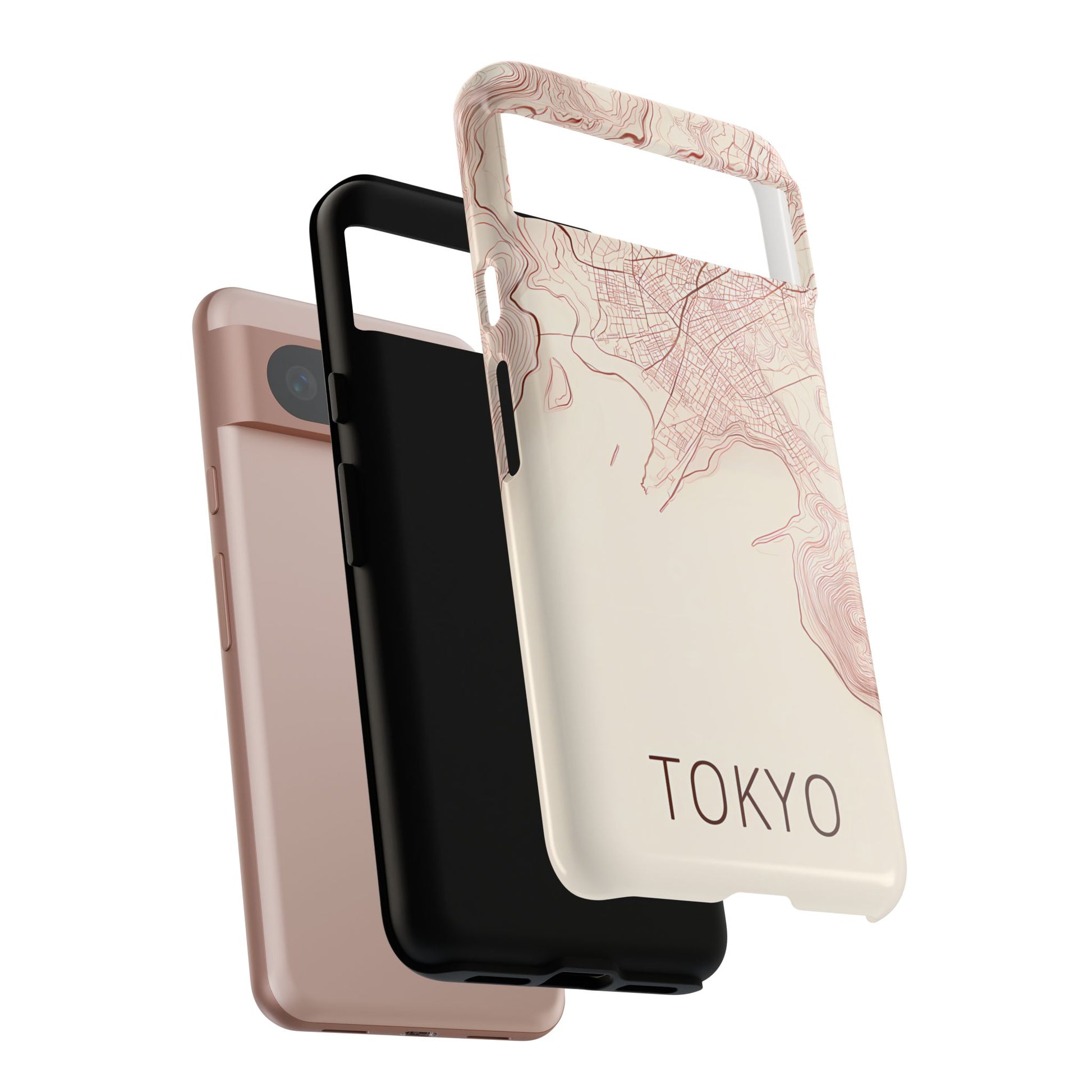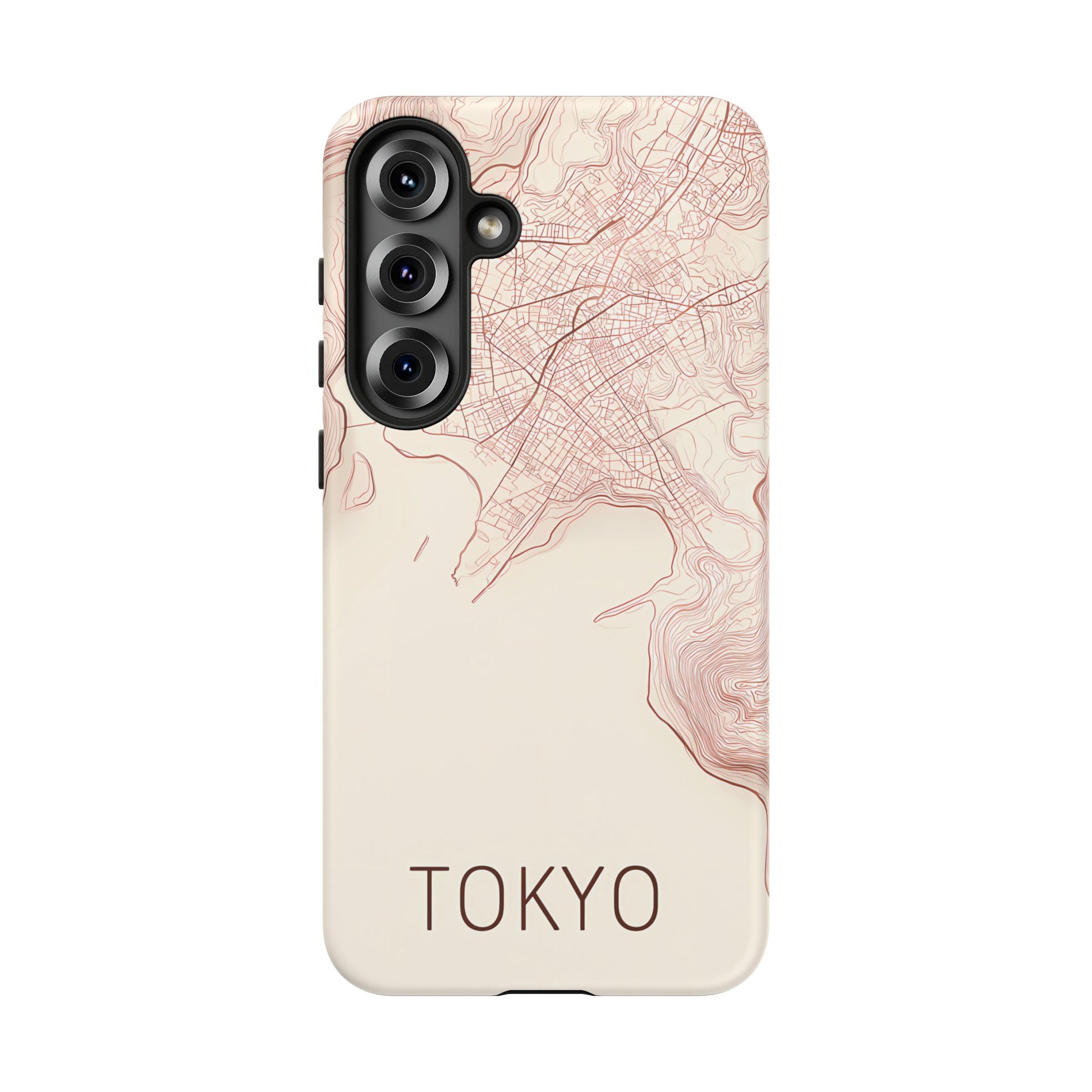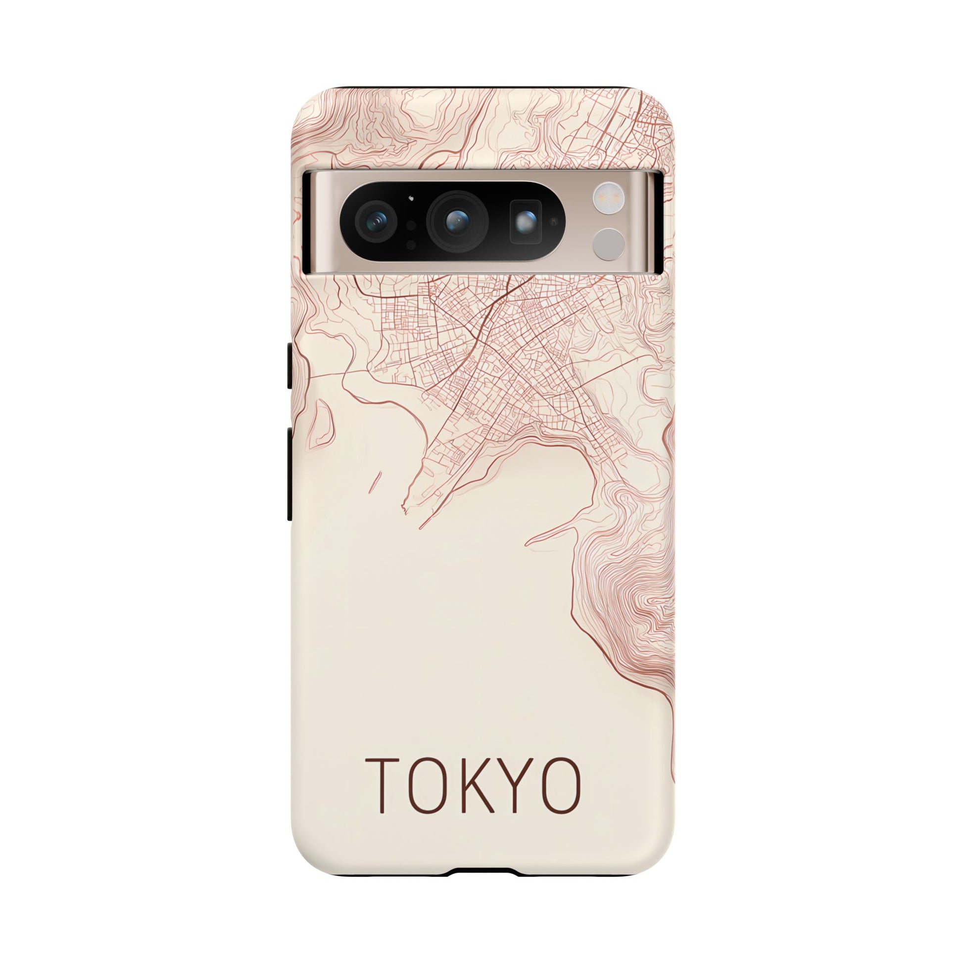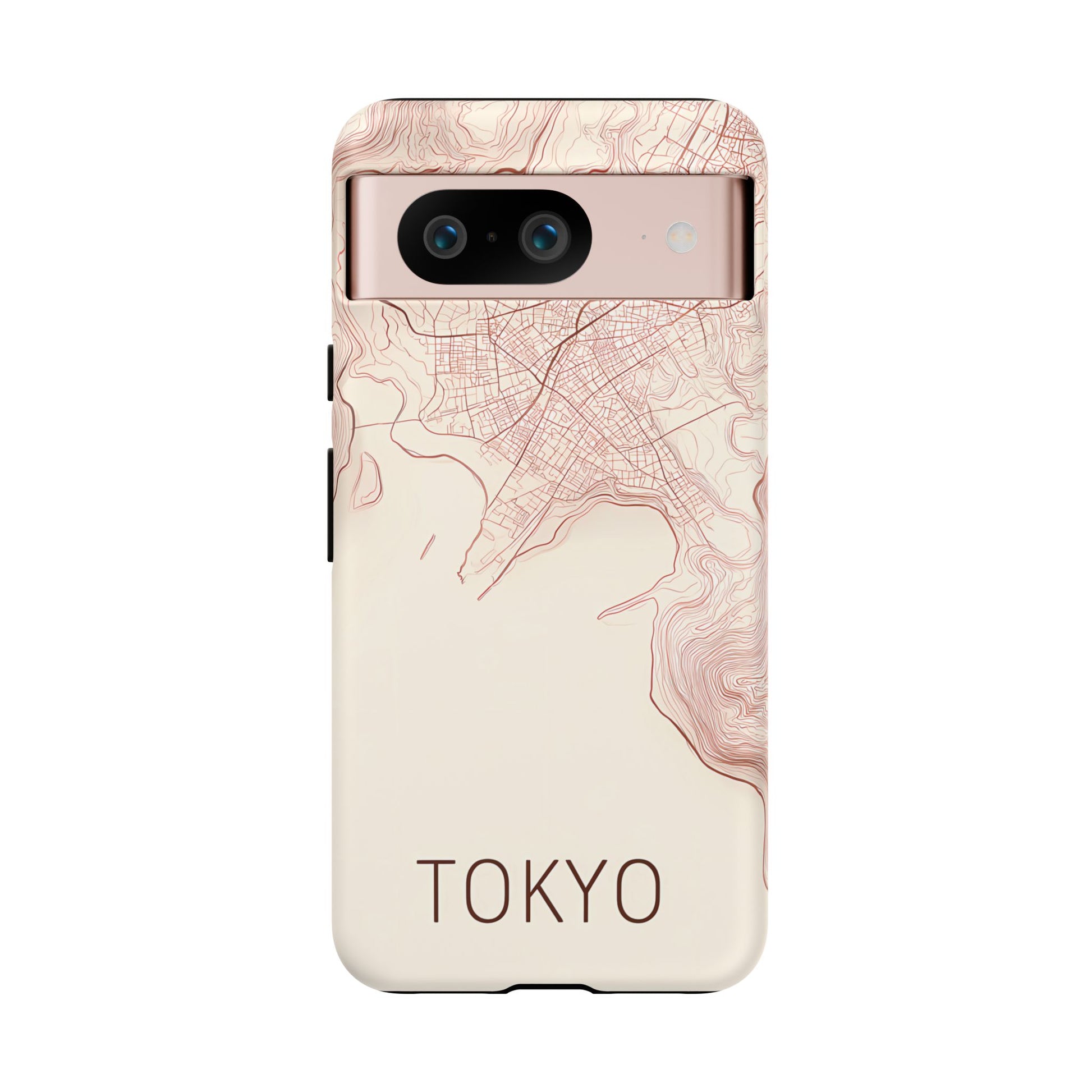 A refined abstract topographic map of Tokyo featuring smooth, flowing contour curves in elegant rose gold on a soft cream background. The word Tokyo appears in clean rose-gold sans-serif type, centered three-quarters down for a minimal, modern aesthetic.