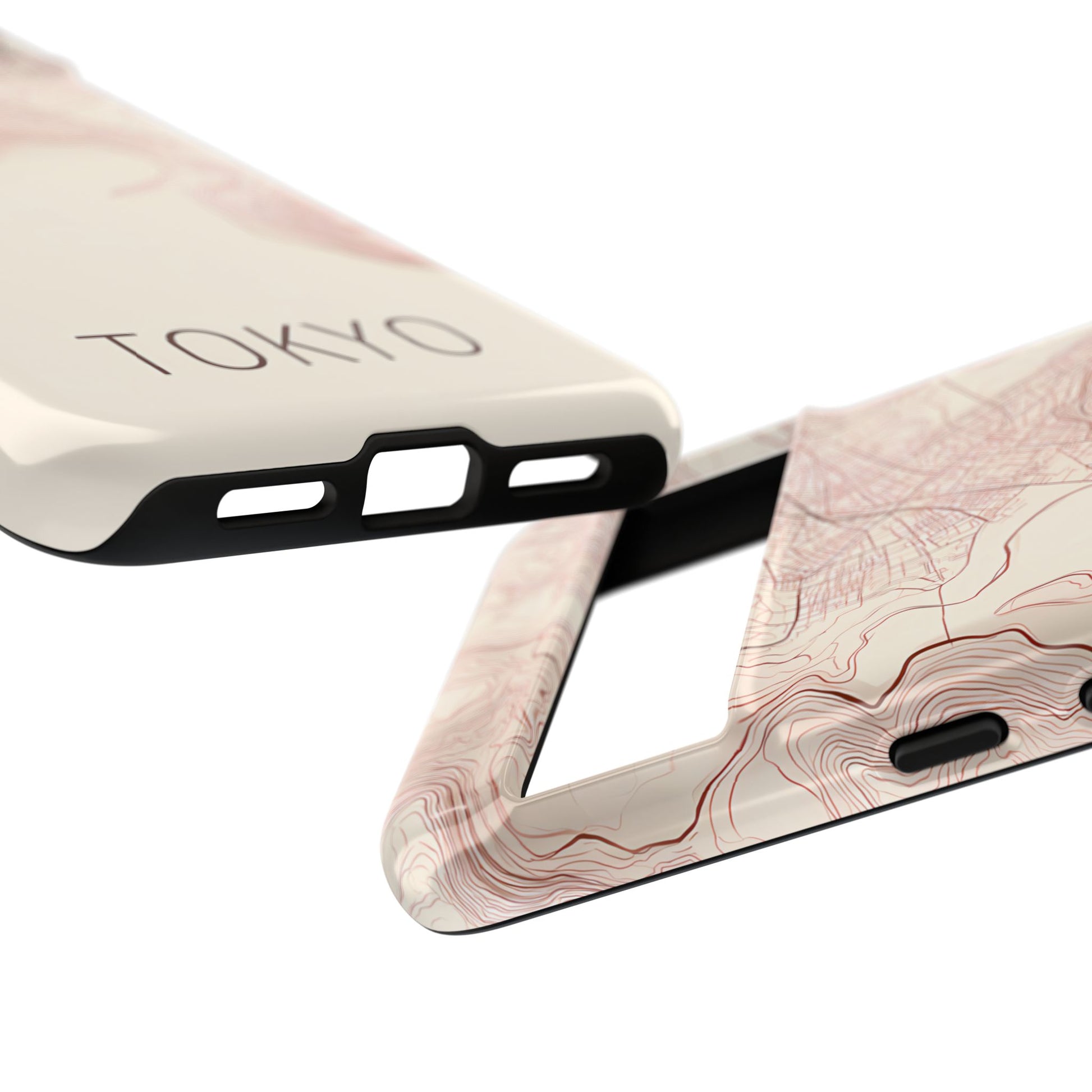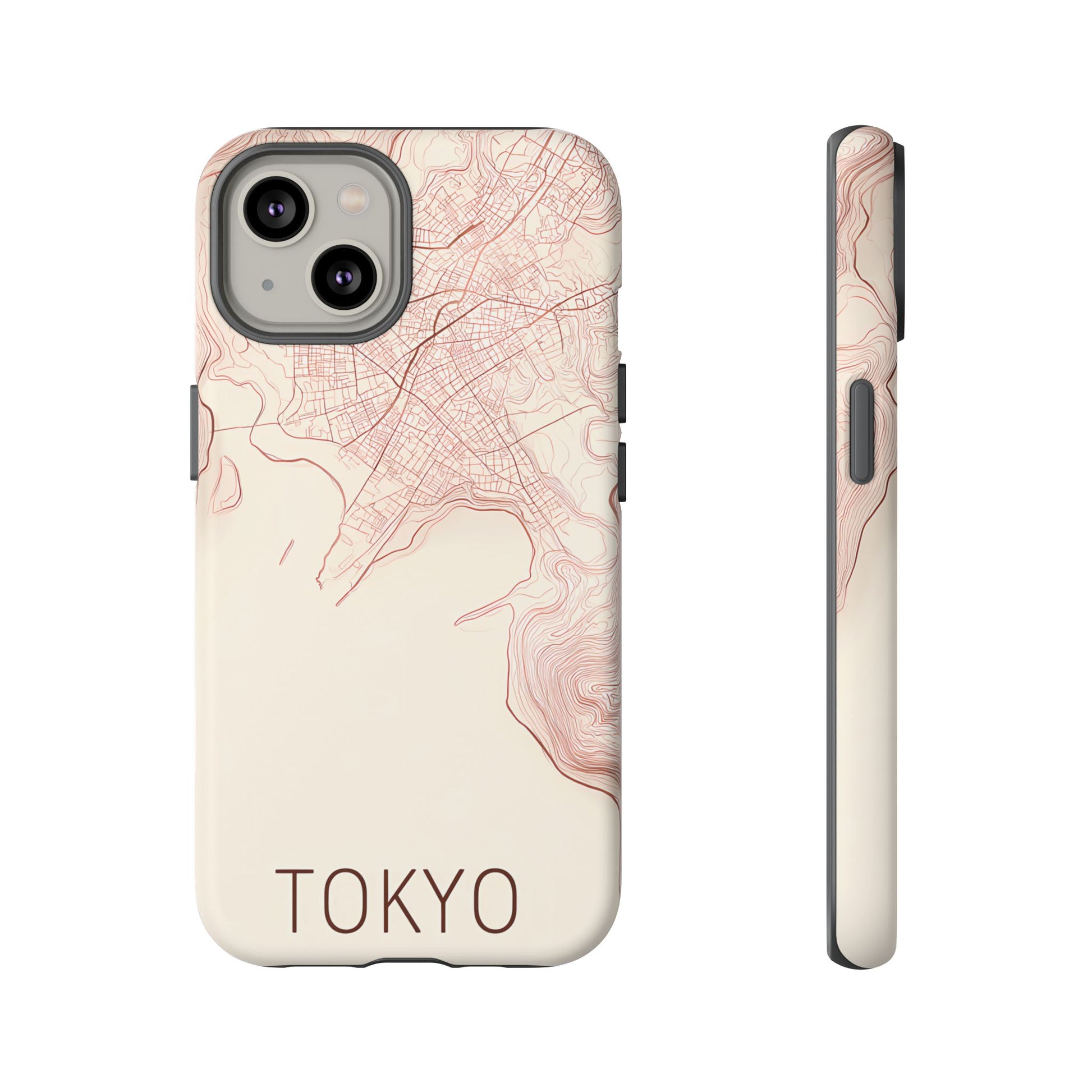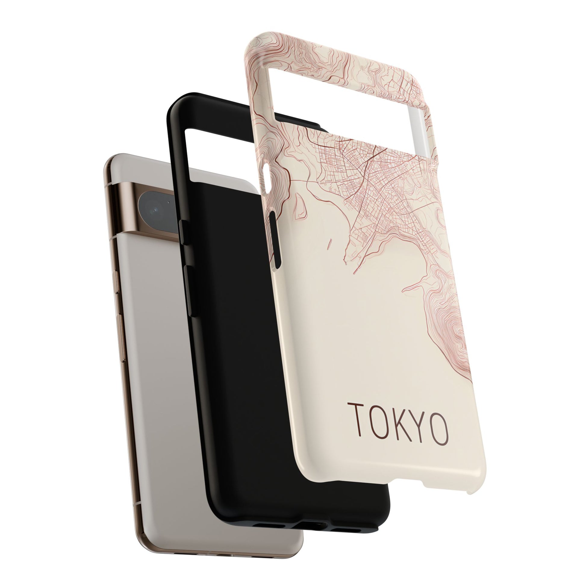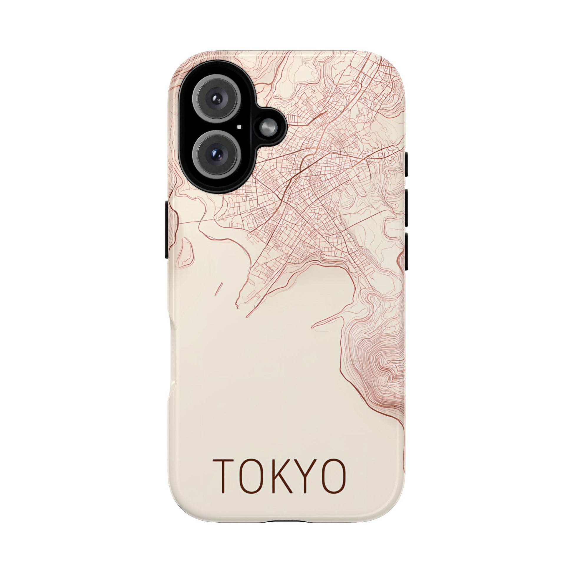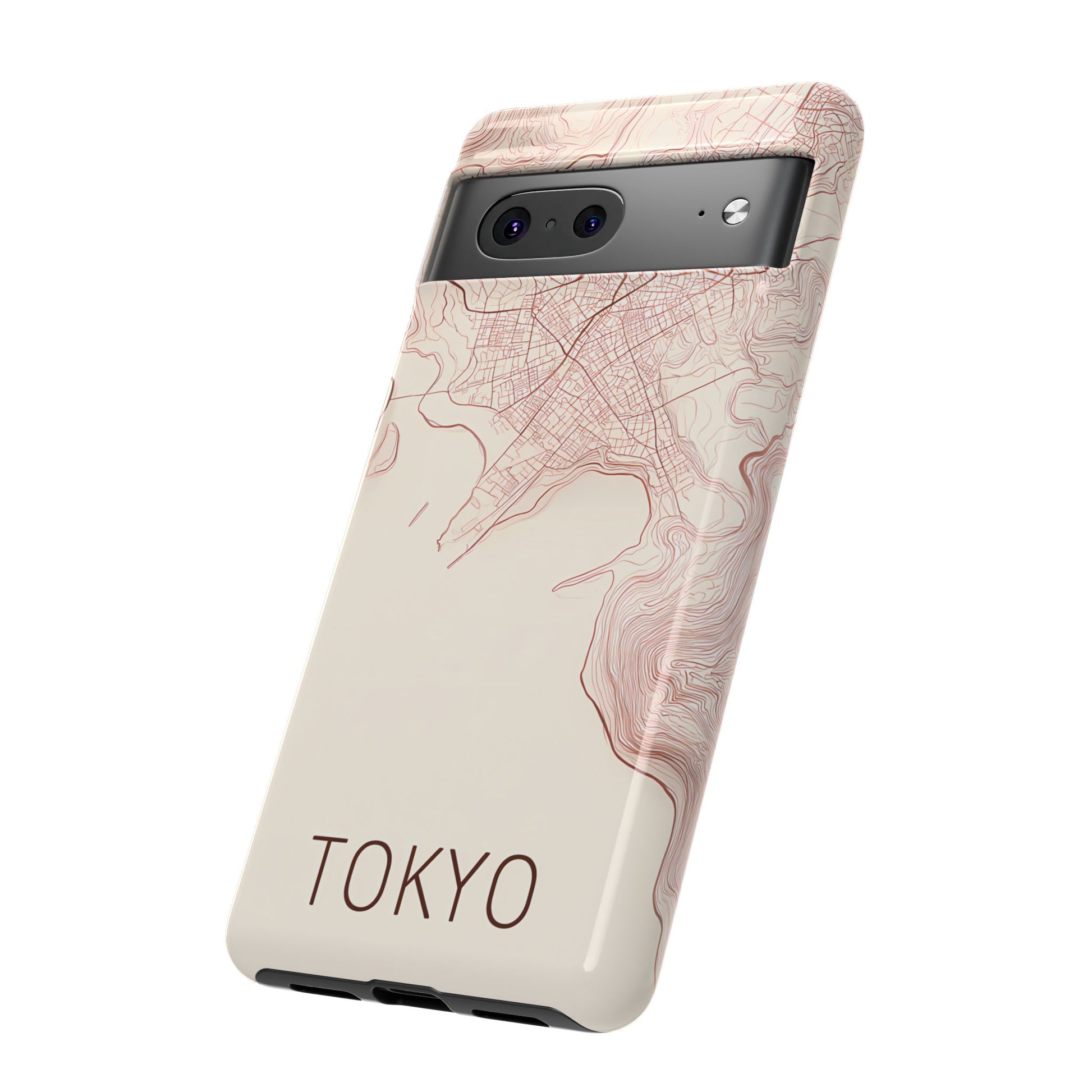 A refined abstract topographic map of Tokyo featuring smooth, flowing contour curves in elegant rose gold on a soft cream background. The word Tokyo appears in clean rose-gold sans-serif type, centered three-quarters down for a minimal, modern aesthetic.