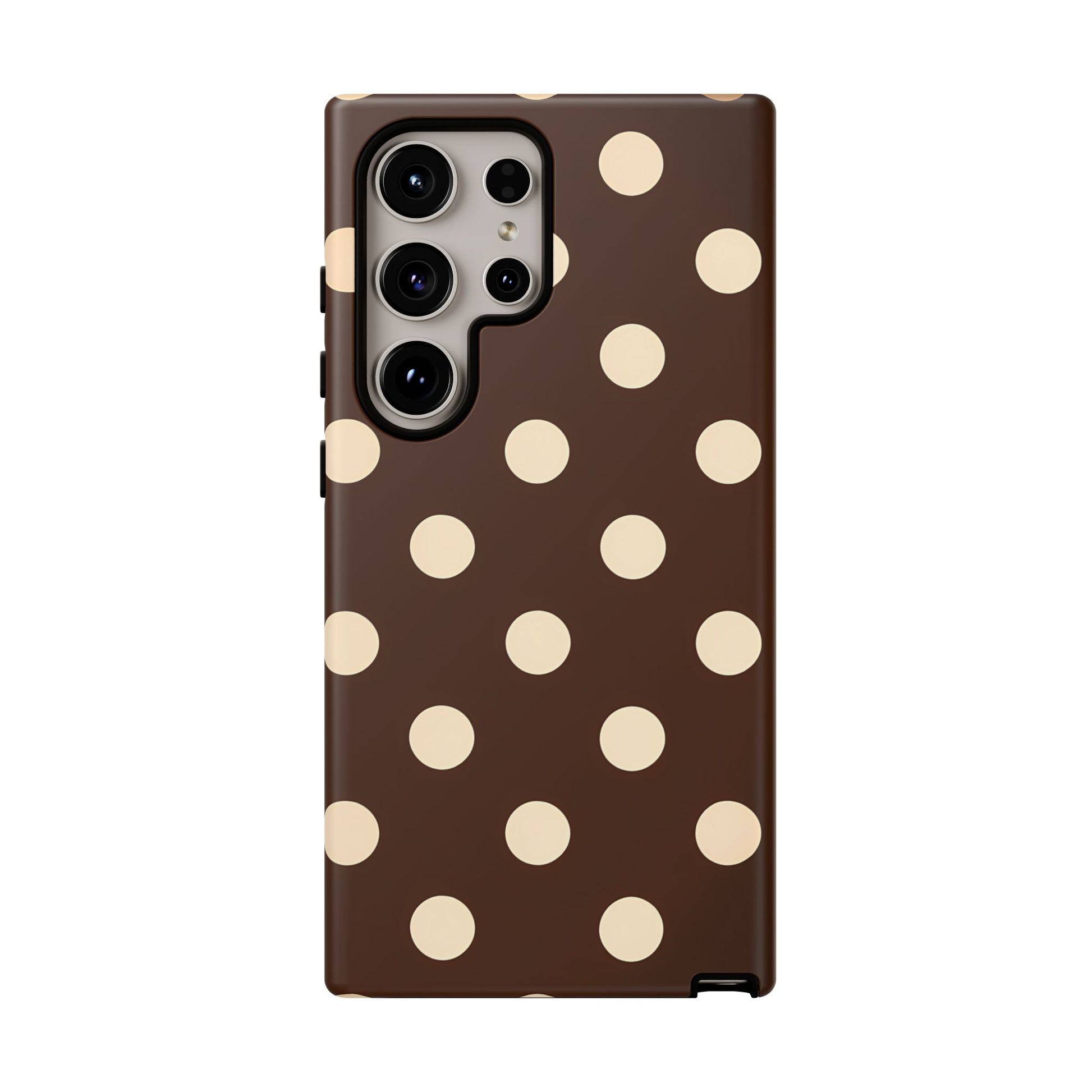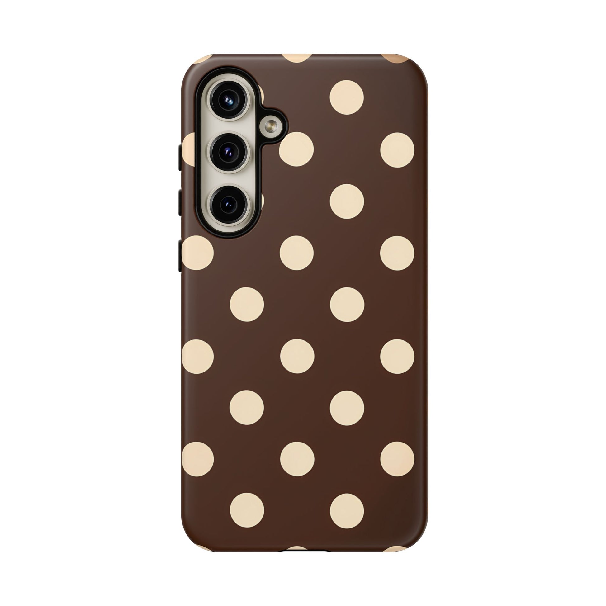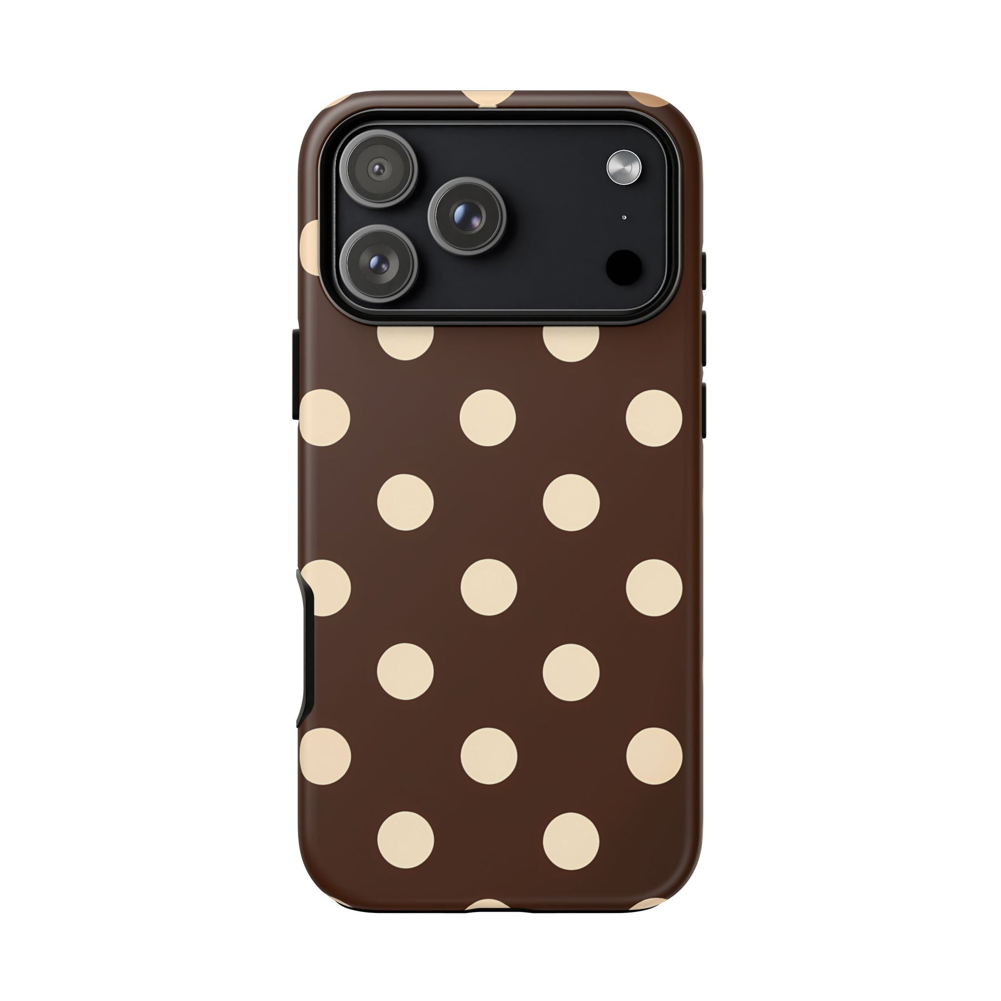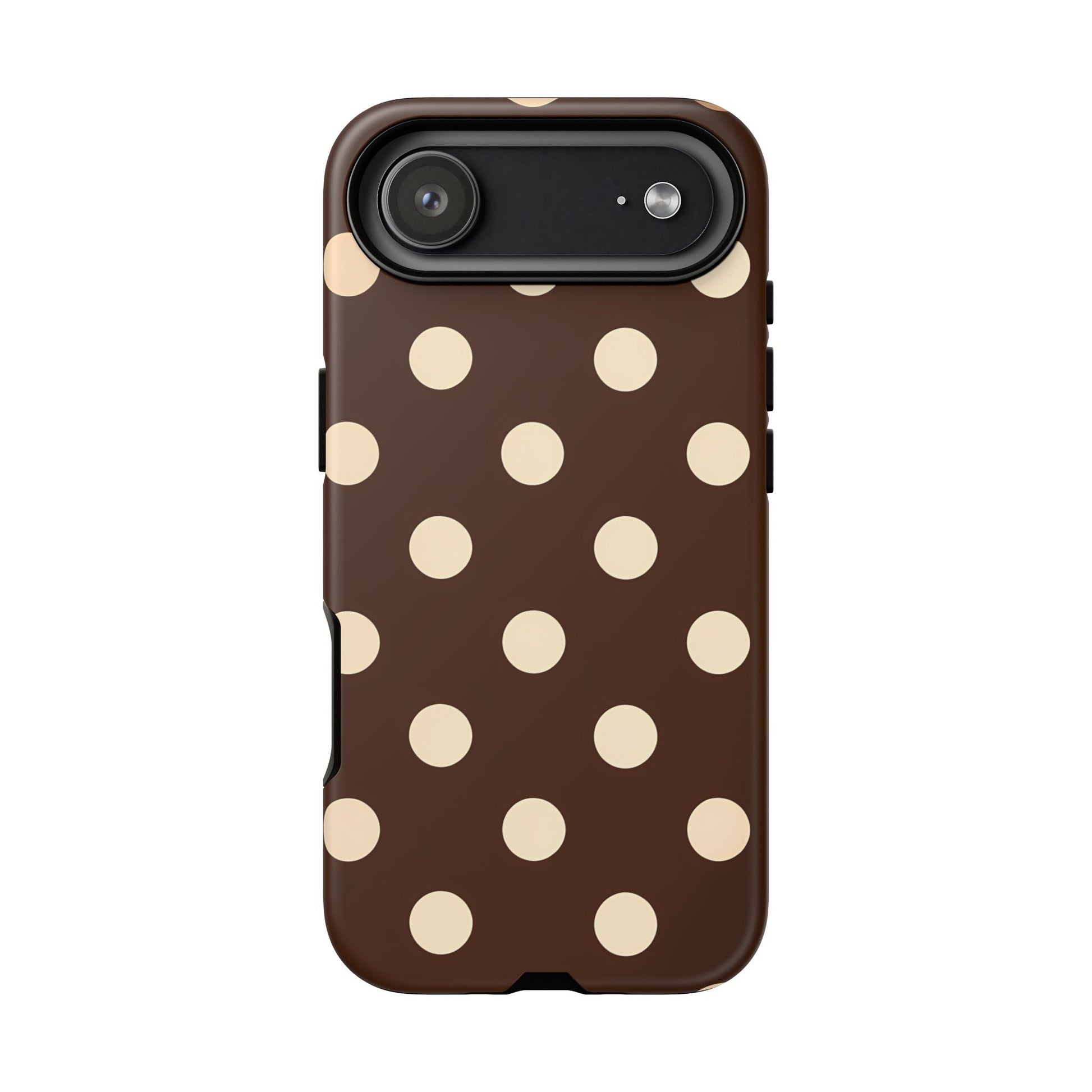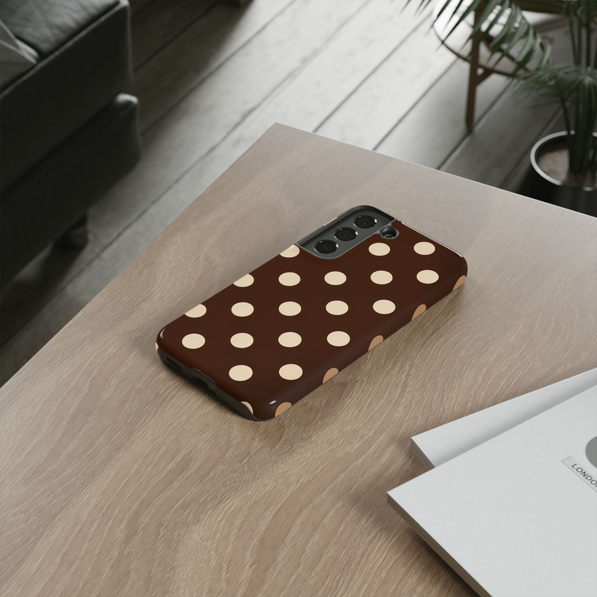 An elegant take on a classic polka-dot design. Small beige dots sit neatly spaced on a warm chocolate background, creating a seamless pattern with rich tones and a minimalist, timeless appeal